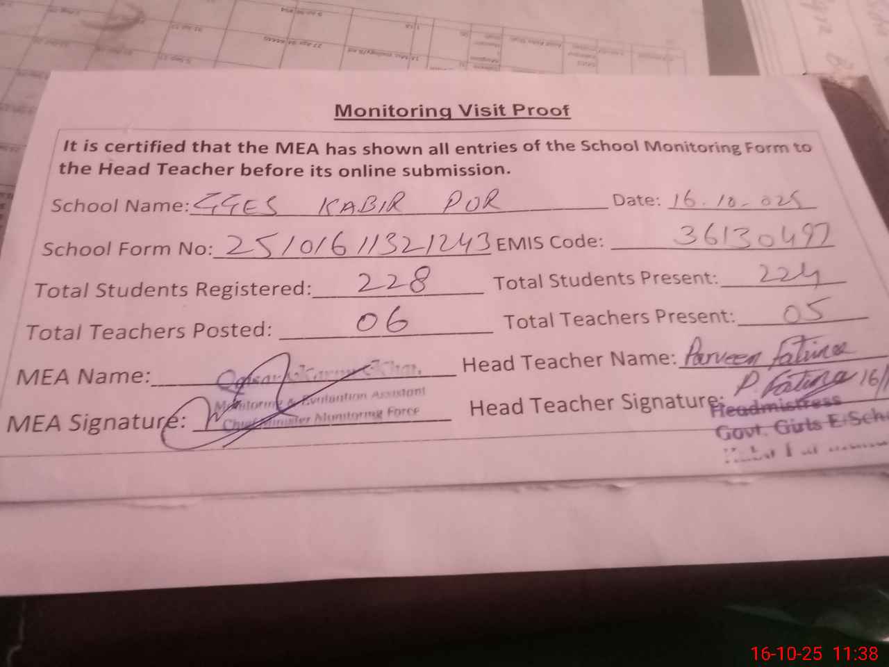 | Attendance Register | Head Teacher | MEA with School | Visit Proof |