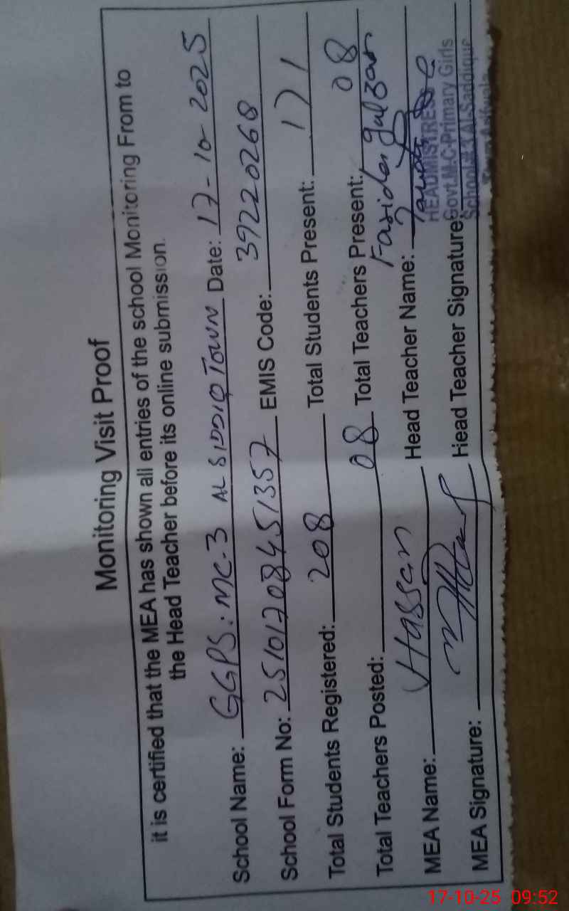 | EMIS Code: 39220268 | Name of School: GGPS MC NO. 3 AL-SADDIQUE TOWN | |||