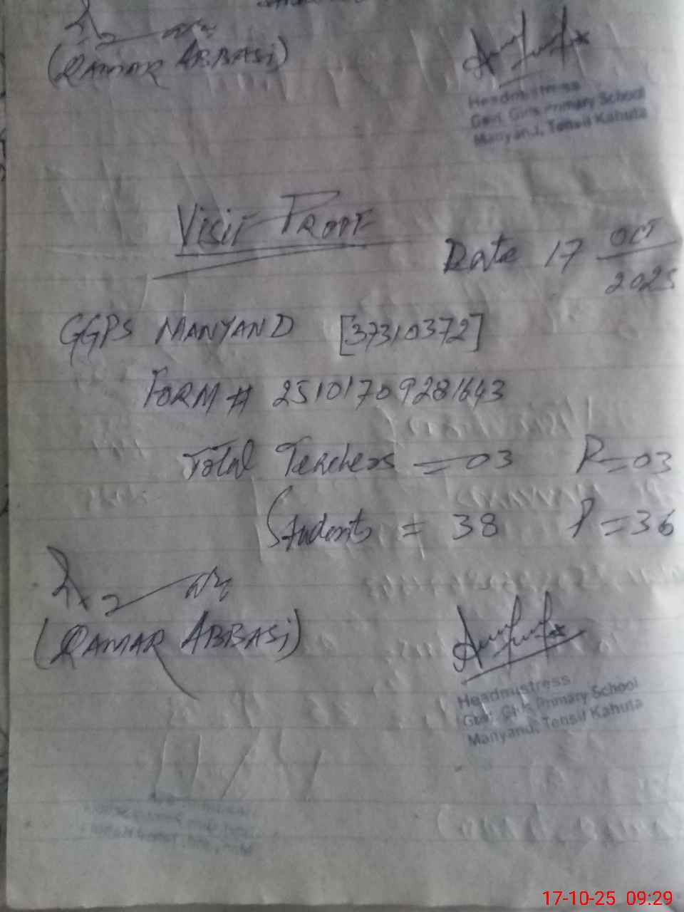 | Attendance Register | Head Teacher | MEA with School | Visit Proof |