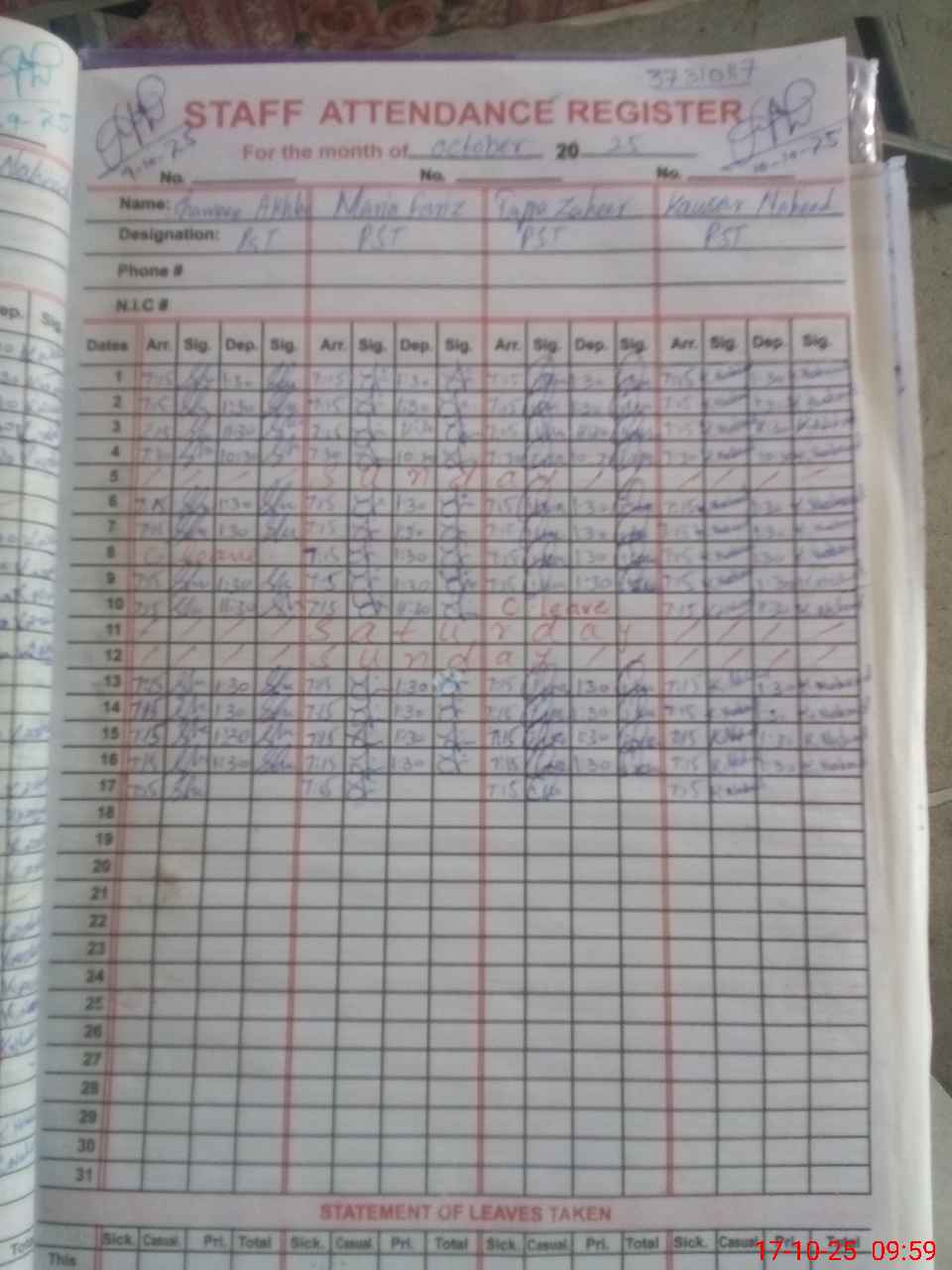| CNIC | Full Name | Designation | R/C | Absence during last cal. month |