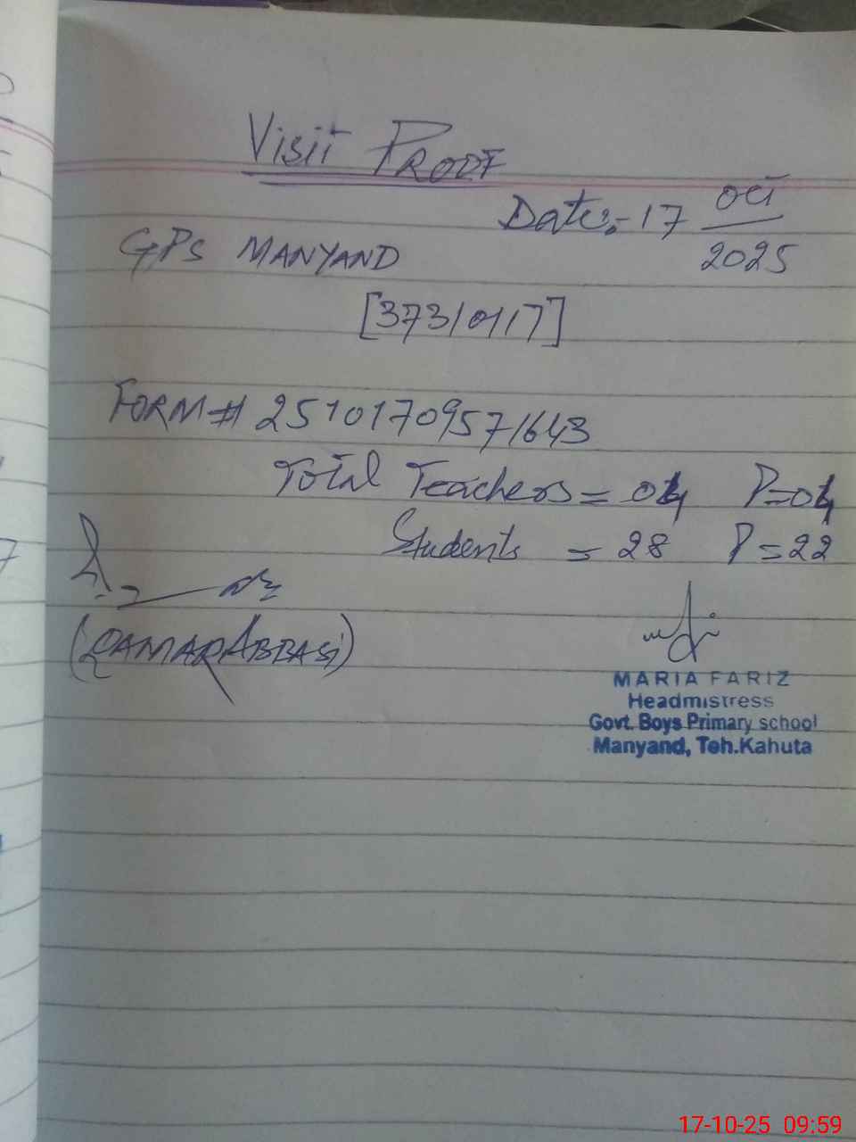 | Attendance Register | Head Teacher | MEA with School | Visit Proof |