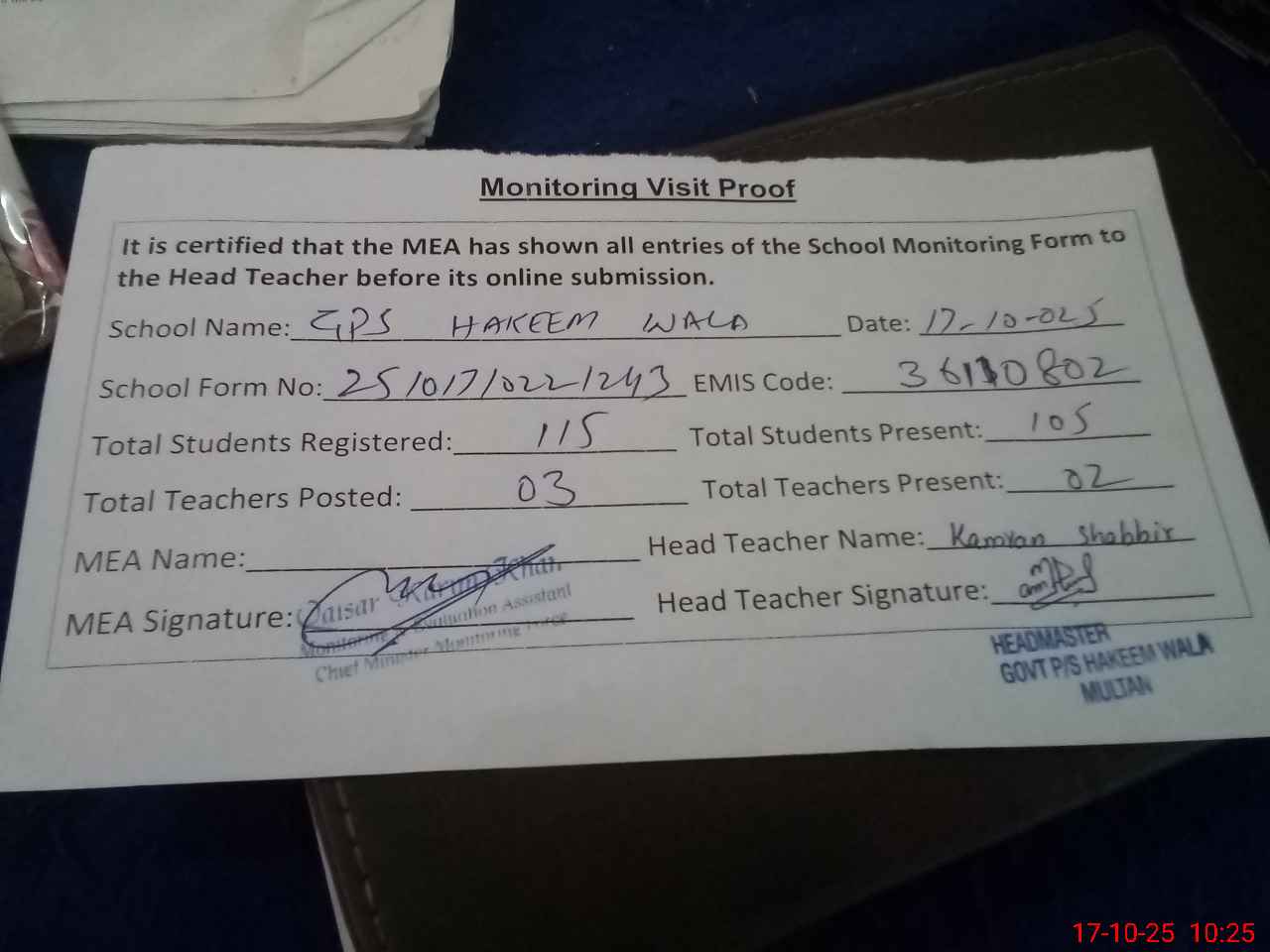 | Attendance Register | Head Teacher | MEA with School | Visit Proof |