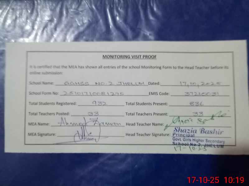 | EMIS Code: 37210031 | Name of School: GGHSS NO.2 JHELUM | |||