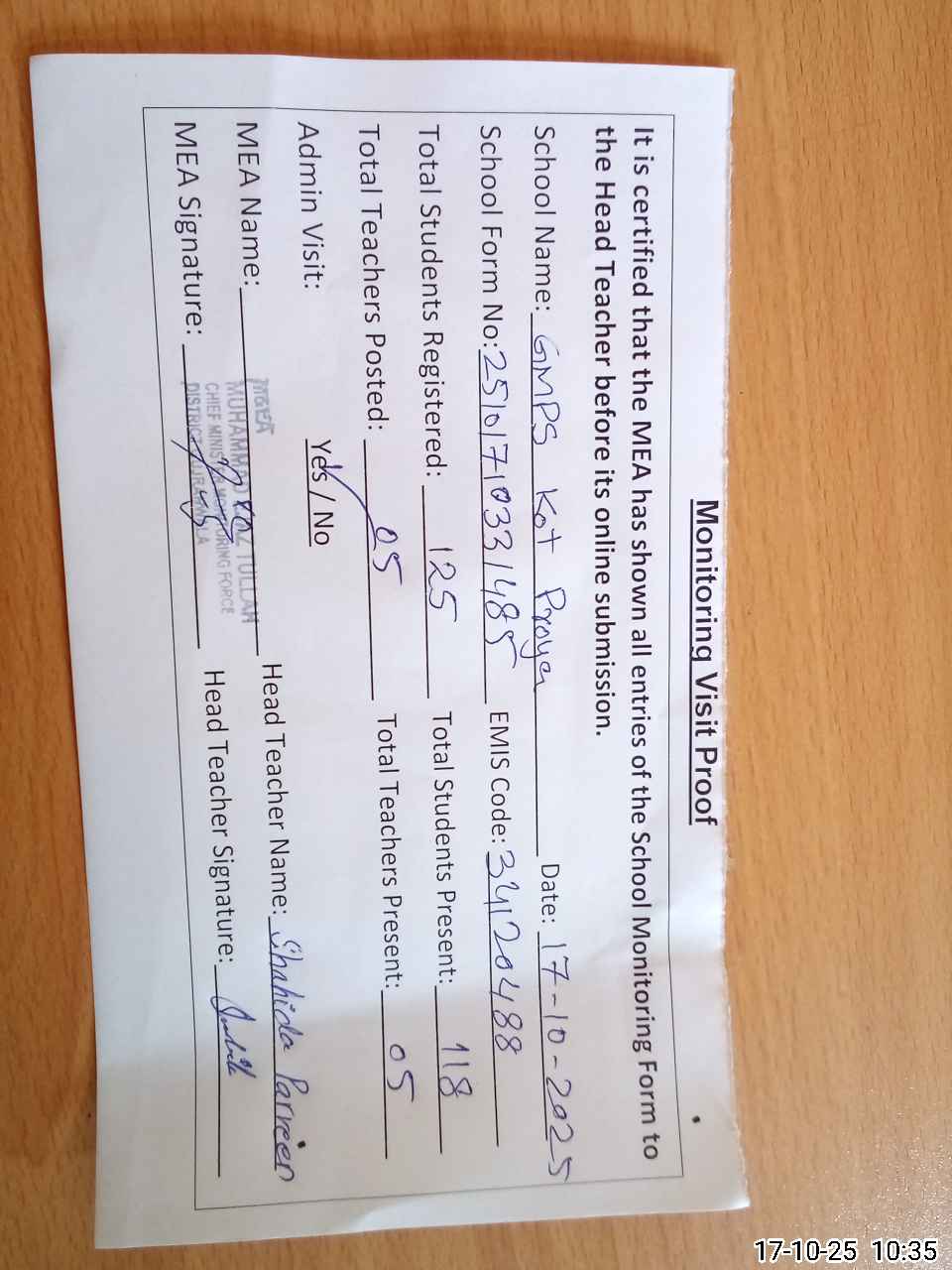 | Attendance Register | Head Teacher | MEA with School | Visit Proof |