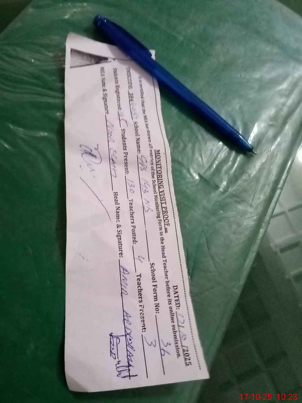 | Attendance Register | Head Teacher | MEA with School | Visit Proof |