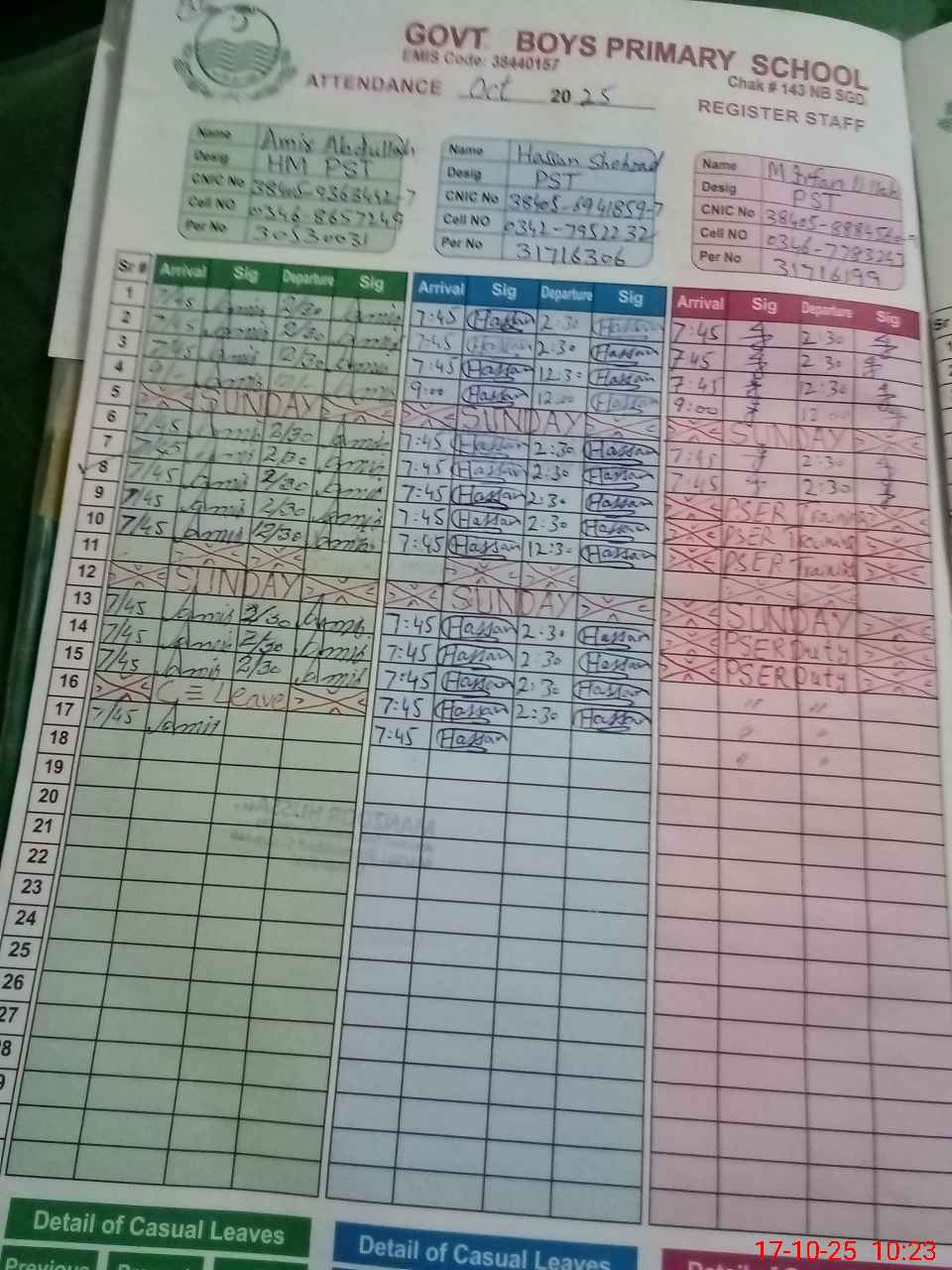 | CNIC | Full Name | Designation | R/C | Absence during last cal. month |