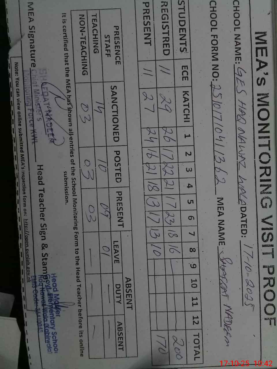 | Certified that this School was Inspected by the Undersigned MEA/DMO Today and the Information Stated Above is as Per Record. | |||||