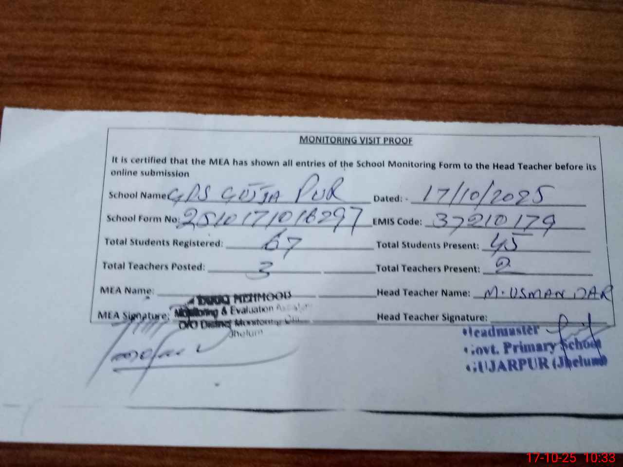 | EMIS Code: 37210179 | Name of School: GPS GUJAR PUR | |||