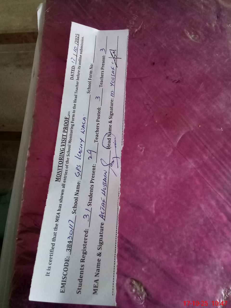 | Attendance Register | Head Teacher | MEA with School | Visit Proof |