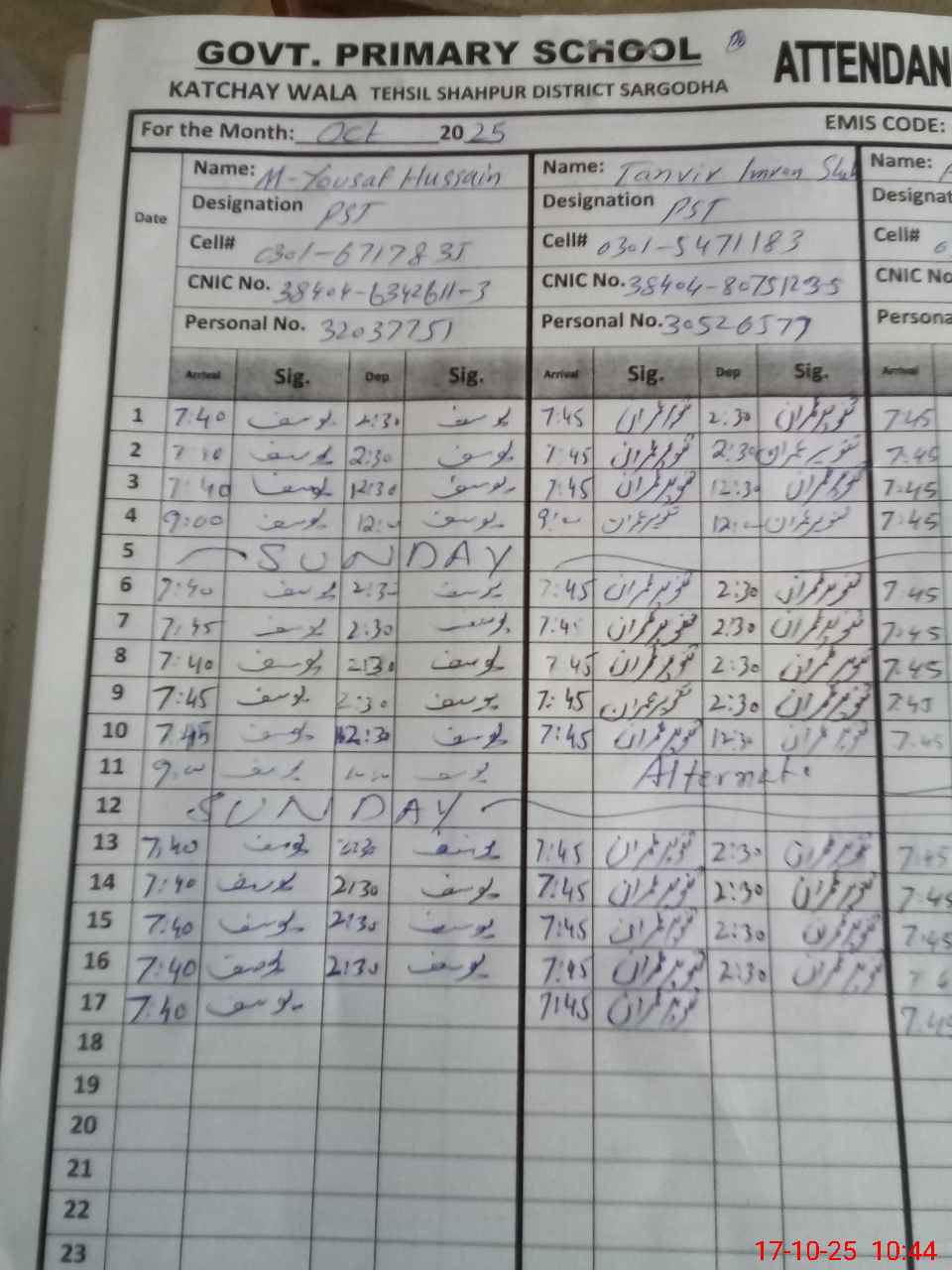 | CNIC | Full Name | Designation | R/C | Absence during last cal. month |