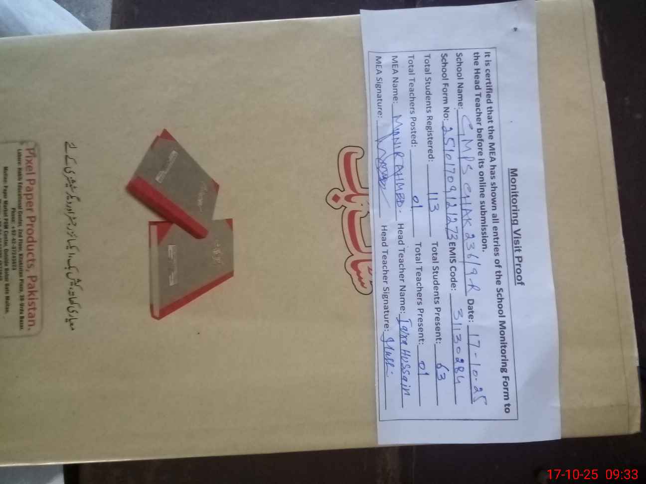 | Attendance Register | Head Teacher | MEA with School | Visit Proof |