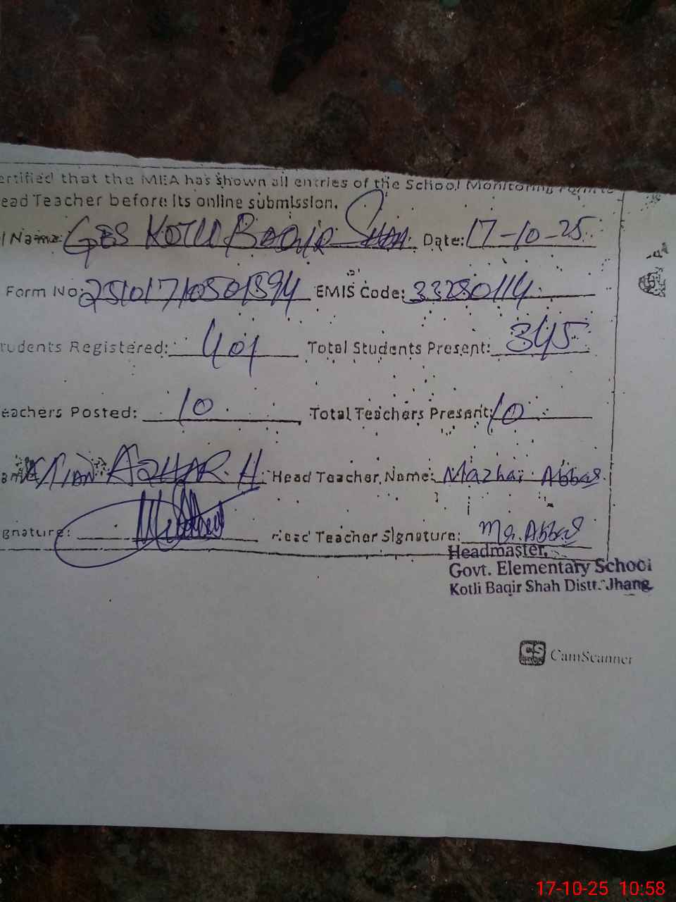 | EMIS Code: 33250114 | Name of School: GES KOTLI BAQIR SHAH | |||