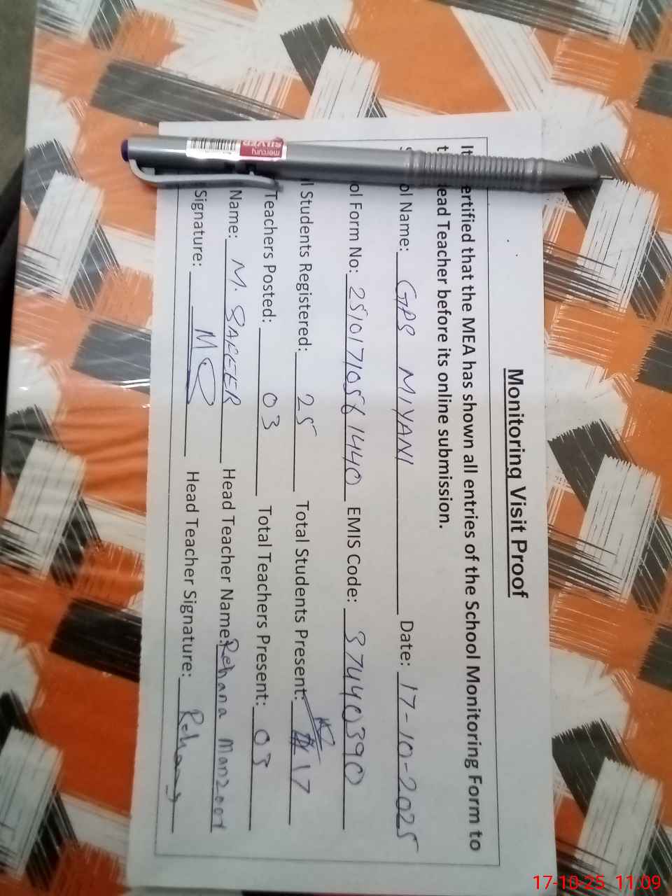 | Attendance Register | Head Teacher | MEA with School | Visit Proof |