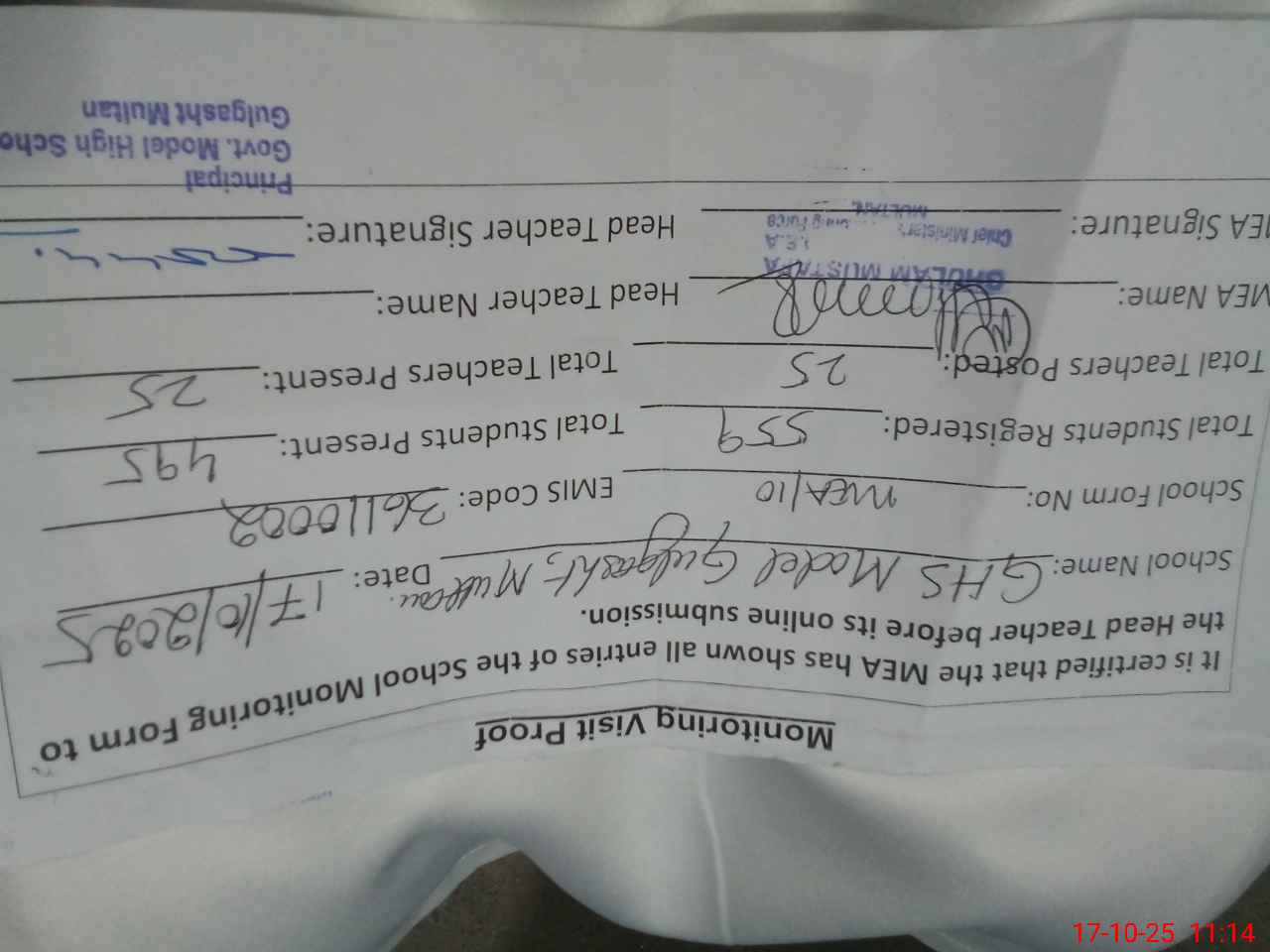 | Certified that this School was Inspected by the Undersigned MEA/DMO Today and the Information Stated Above is as Per Record. | |||||