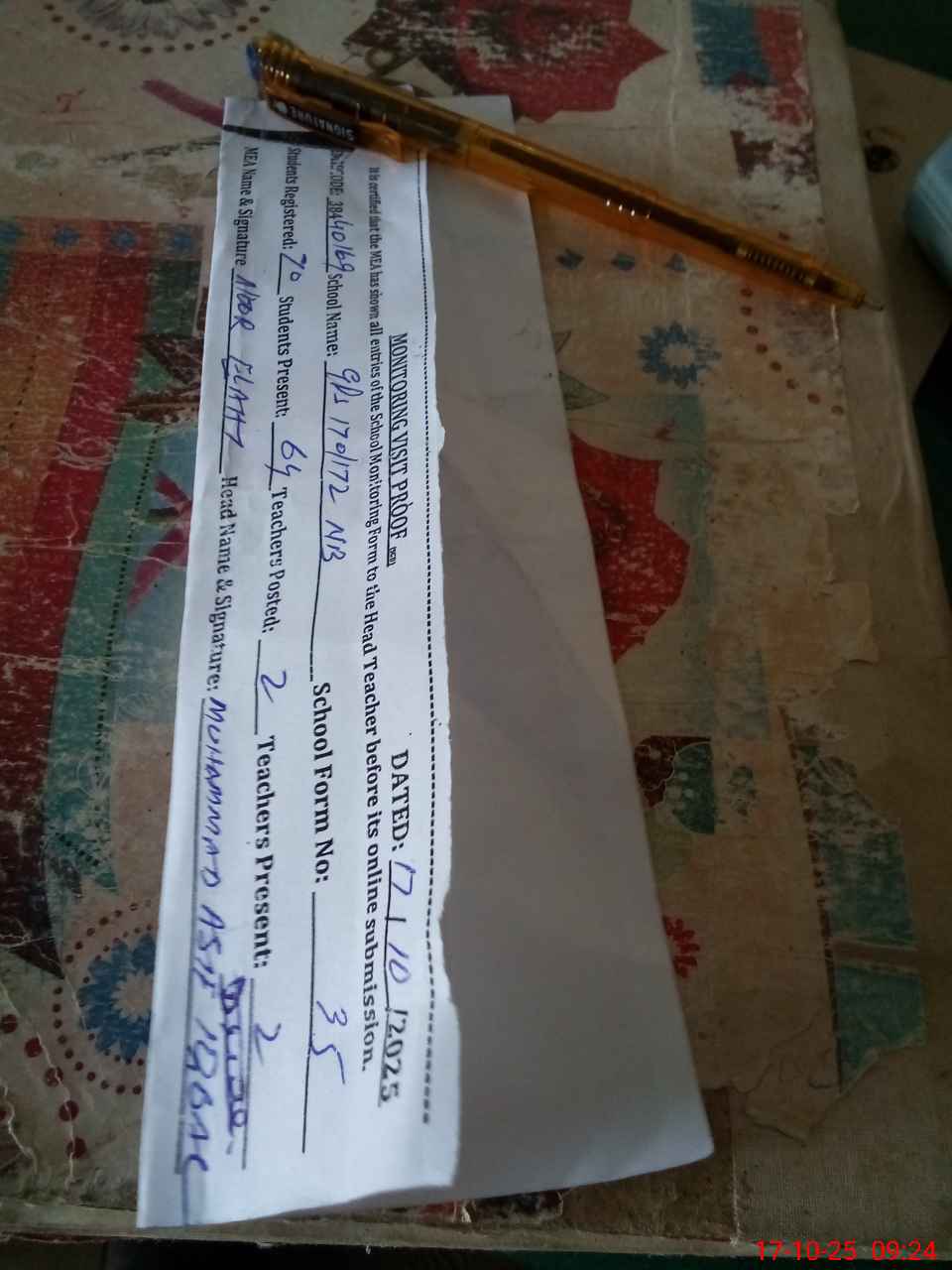 | Attendance Register | Head Teacher | MEA with School | Visit Proof |