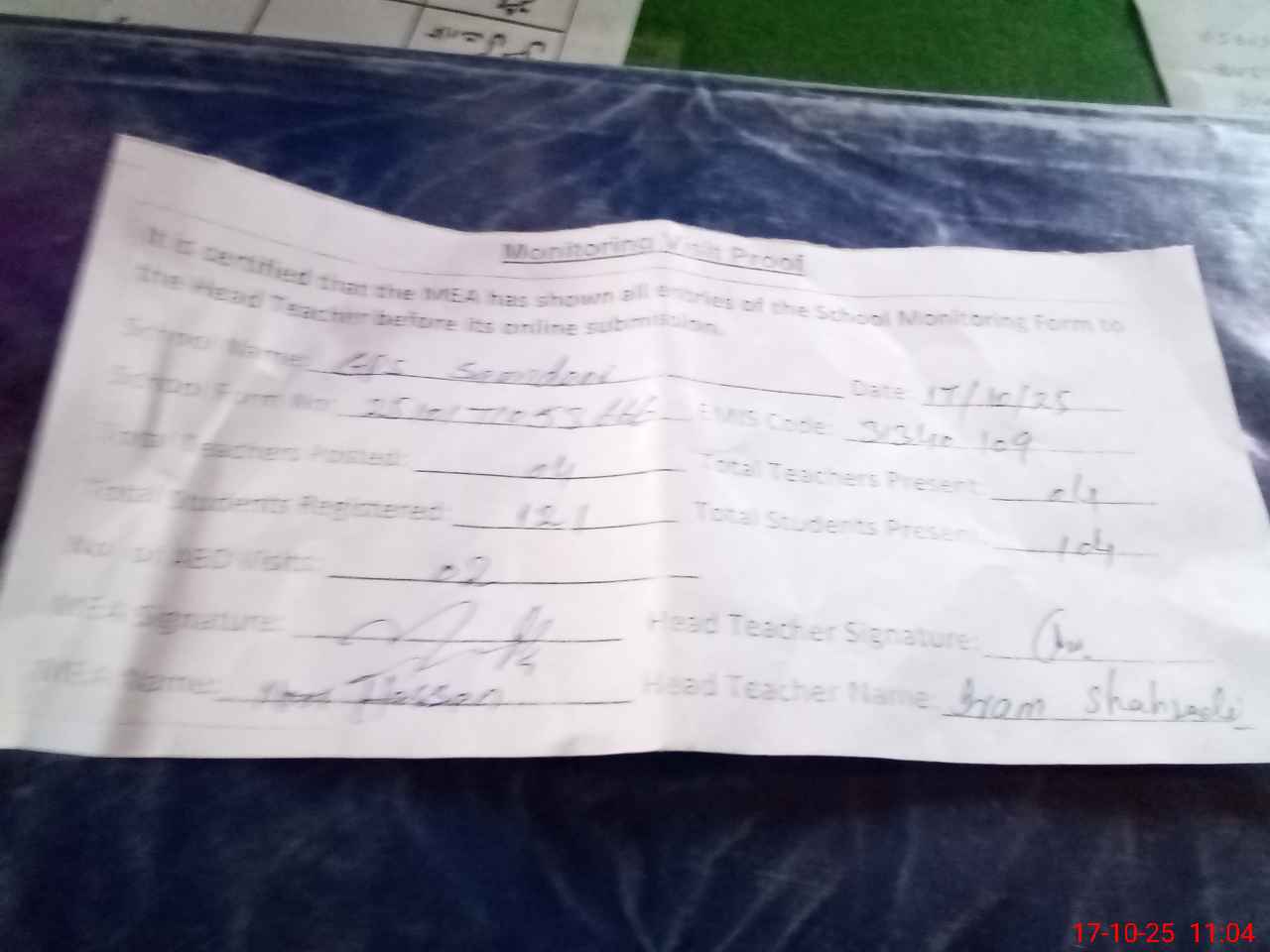 | Attendance Register | Head Teacher | MEA with School | Visit Proof |