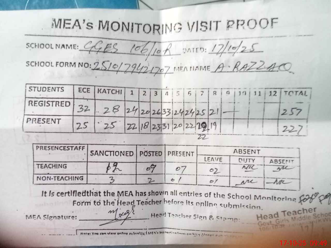| Attendance Register | Head Teacher | MEA with School | Visit Proof |