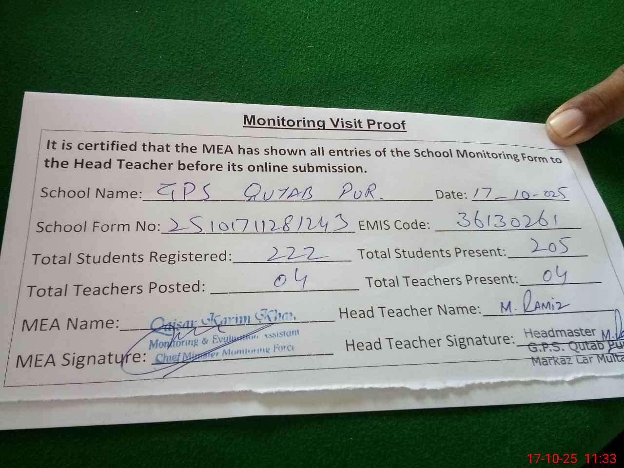 | Monitoring Date: 17-10-2025 | Start Time: 17-10-2025 11:21 AM | End Time: 17-10-2025 11:34 AM | Name of MEA: Qa**** Ka**** Kh**** | |