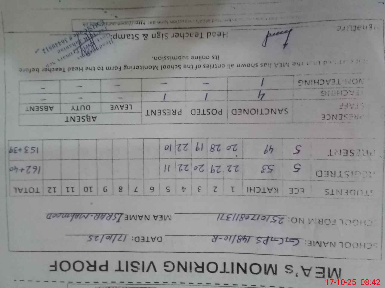 | Attendance Register | Head Teacher | MEA with School | Visit Proof |
