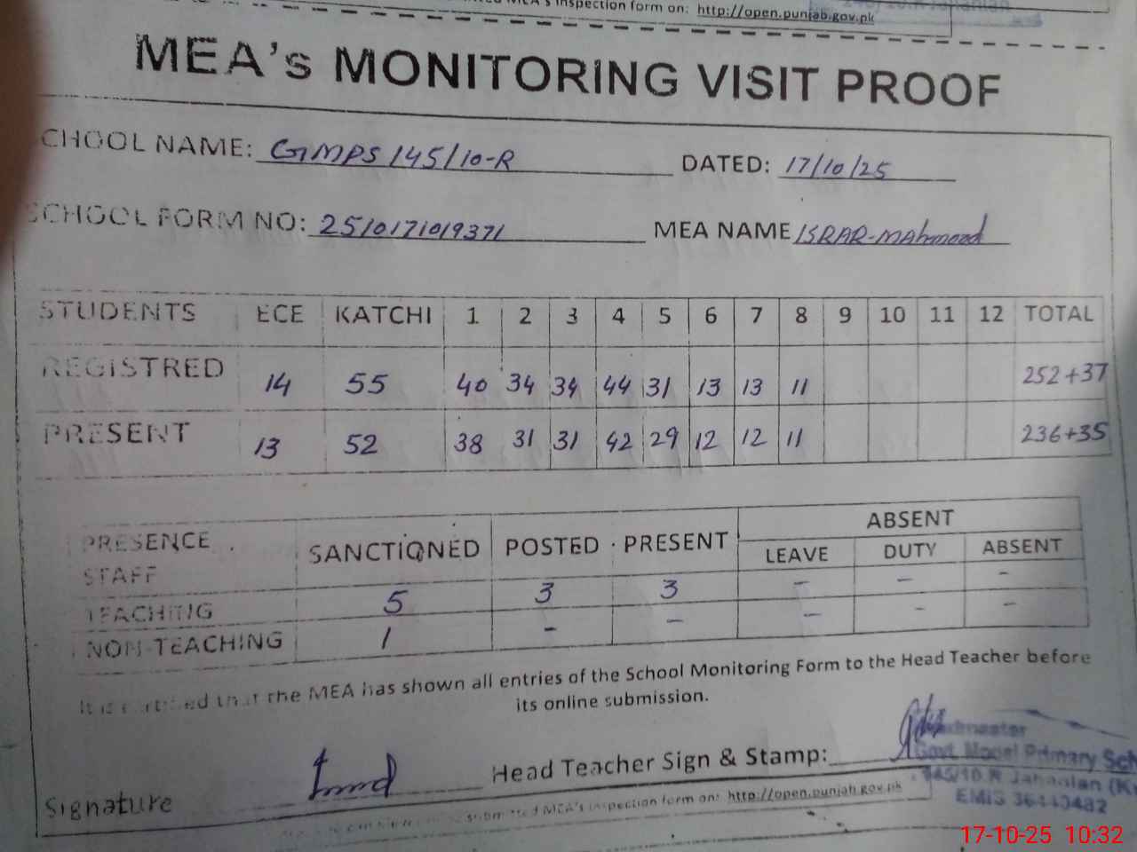 | EMIS Code: 36440482 | Name of School: GMPS 145/10-R, JAHANIAN | |||