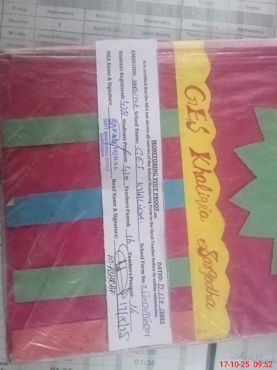 | EMIS Code: 38420126 | Name of School: GES KHALIQIA BLOCK 25, SARGODHA | |||