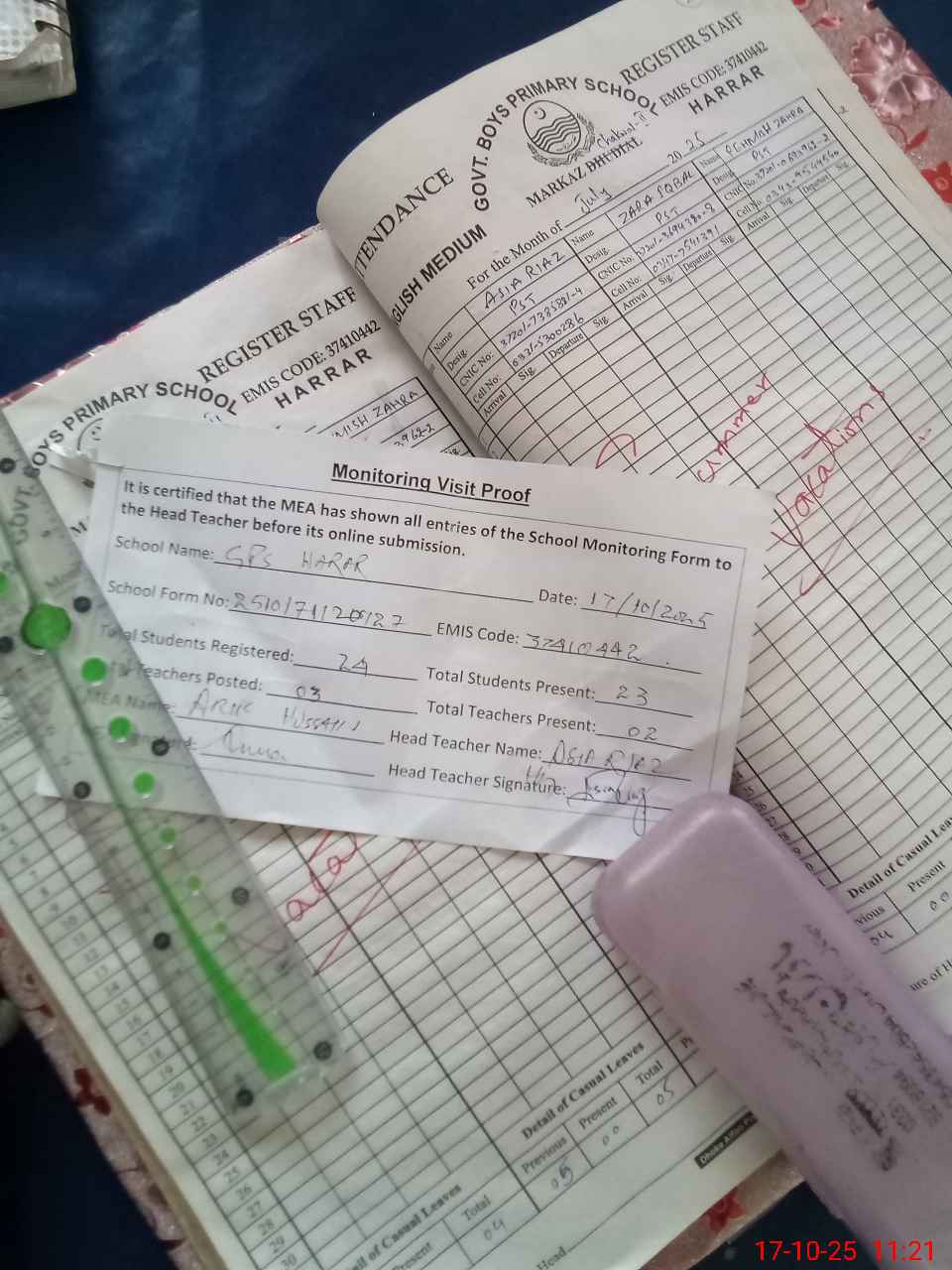 | Attendance Register | Head Teacher | MEA with School | Visit Proof |