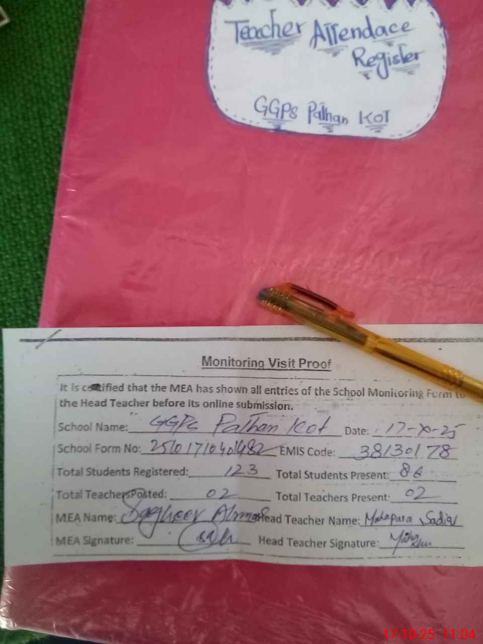 | Attendance Register | Head Teacher | MEA with School | Visit Proof |
