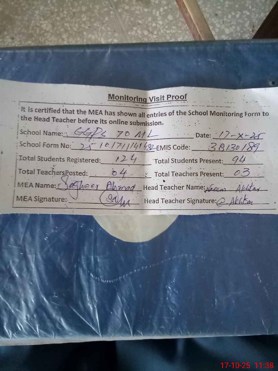 | EMIS Code: 38130189 | Name of School: GGPS CHAK NO.70/ML | |||