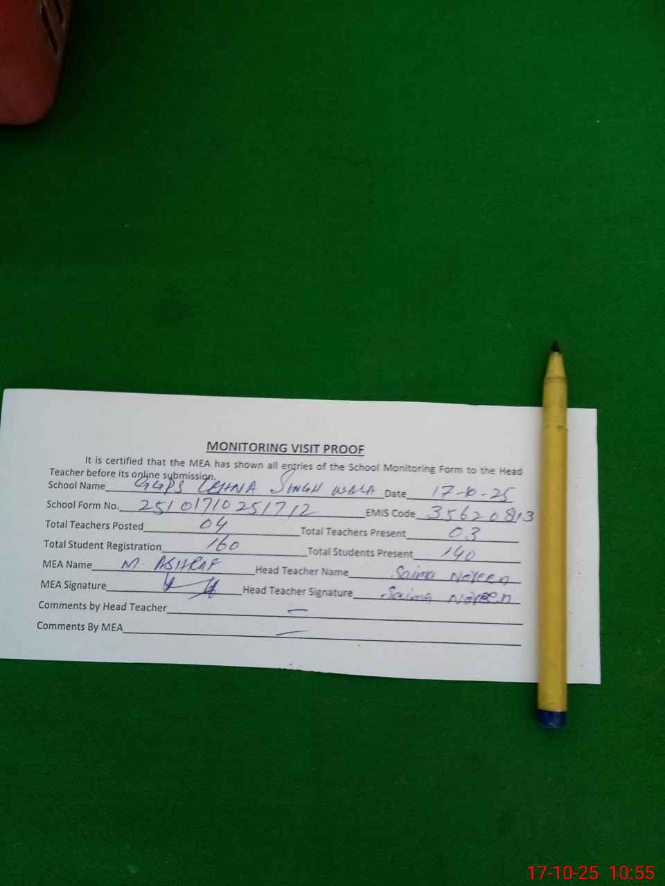 | Attendance Register | Head Teacher | MEA with School | Visit Proof |