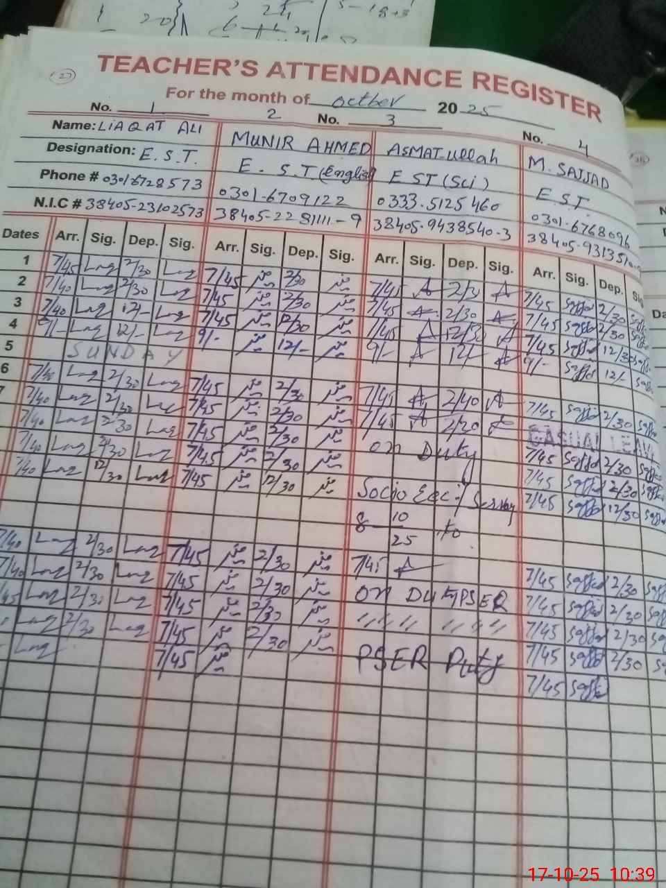 | CNIC | Full Name | Designation | R/C | Absence during last cal. month |