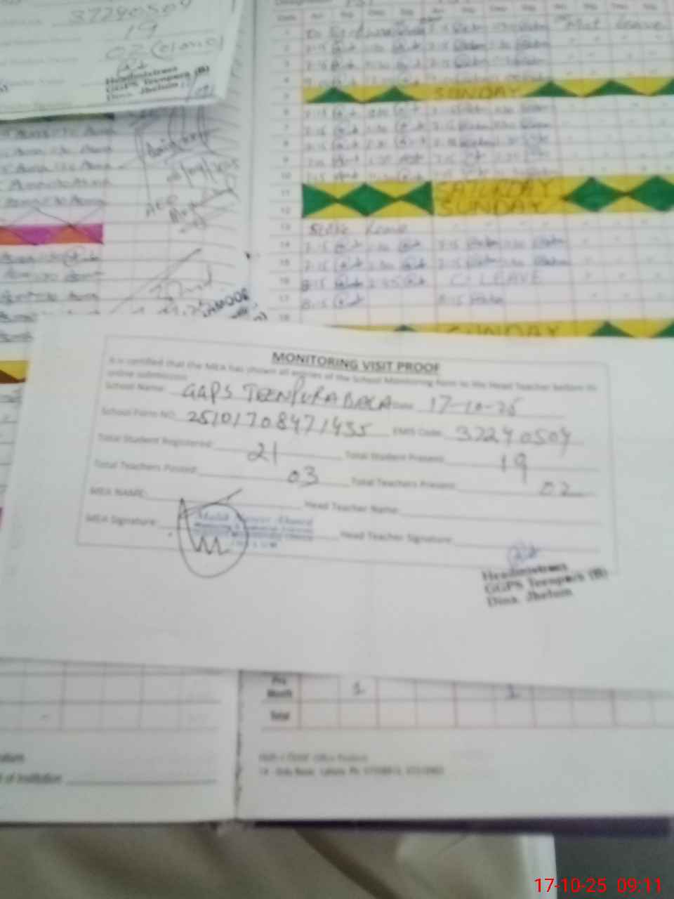 | Attendance Register | Head Teacher | MEA with School | Visit Proof |