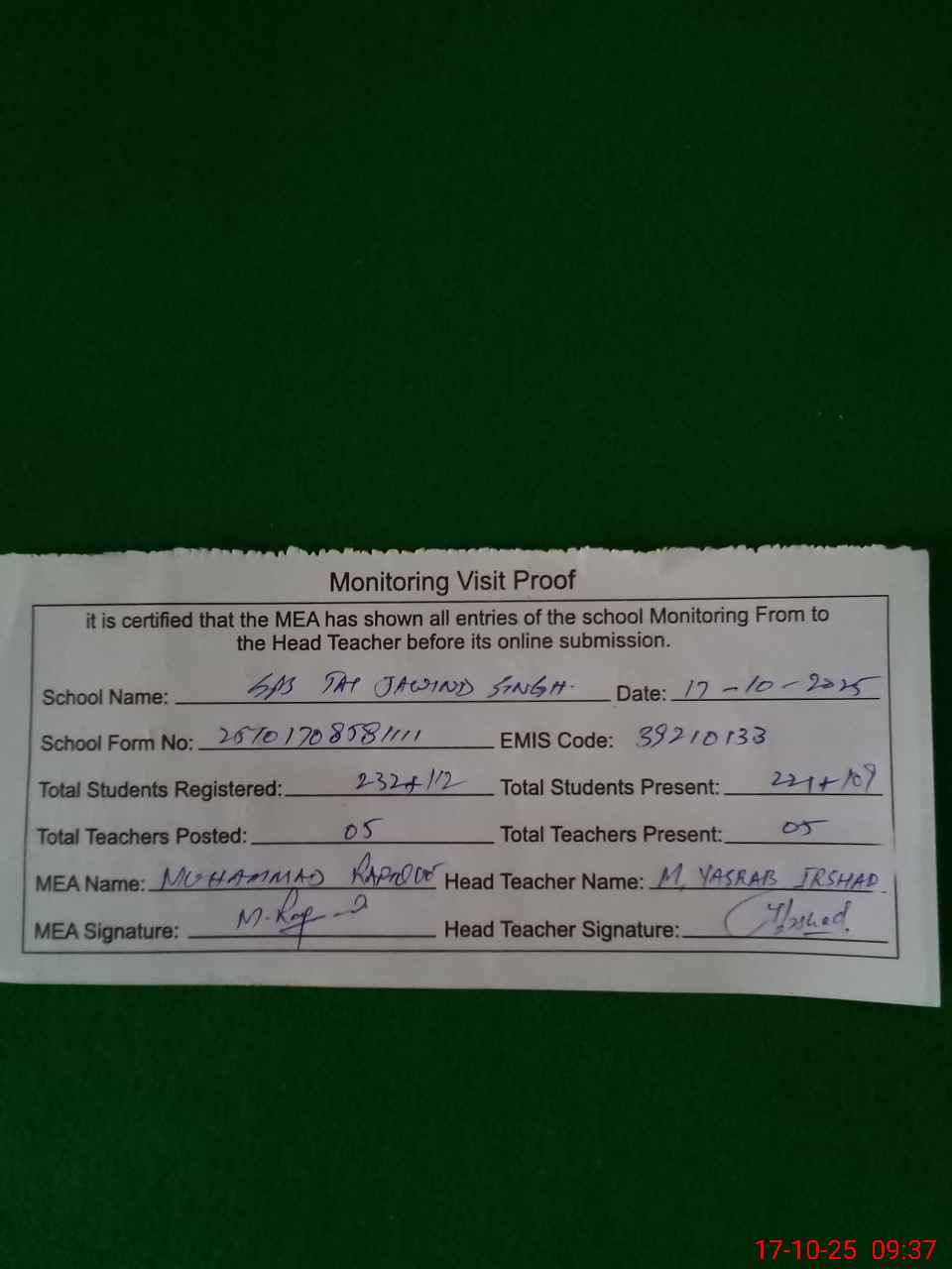 | Attendance Register | Head Teacher | MEA with School | Visit Proof |