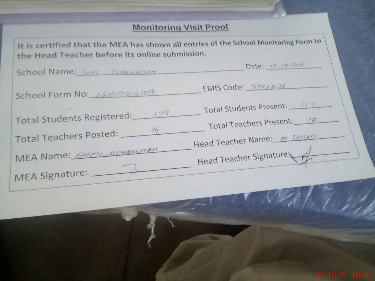 | Attendance Register | Head Teacher | MEA with School | Visit Proof |