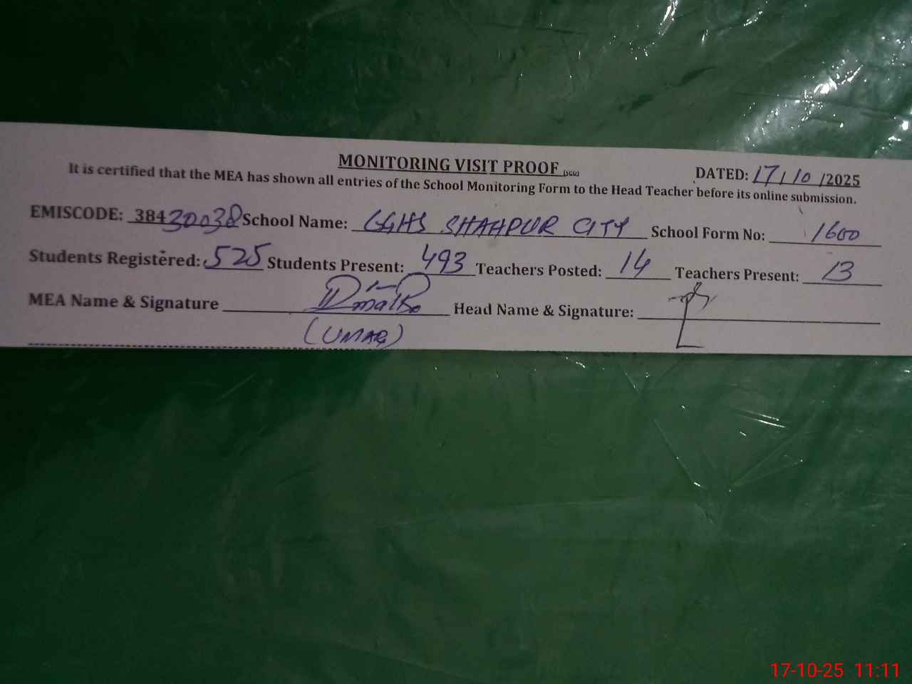 | Certified that this School was Inspected by the Undersigned MEA/DMO Today and the Information Stated Above is as Per Record. | |||||