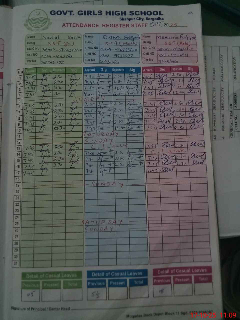 | CNIC | Full Name | Designation | R/C | Absence during last cal. month |