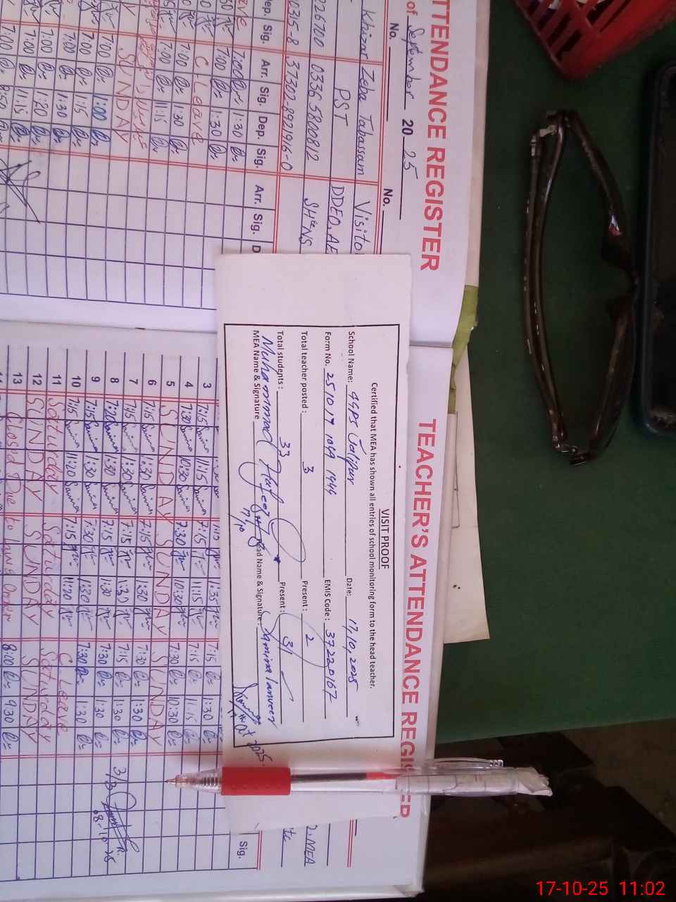 | Attendance Register | Head Teacher | MEA with School | Visit Proof |