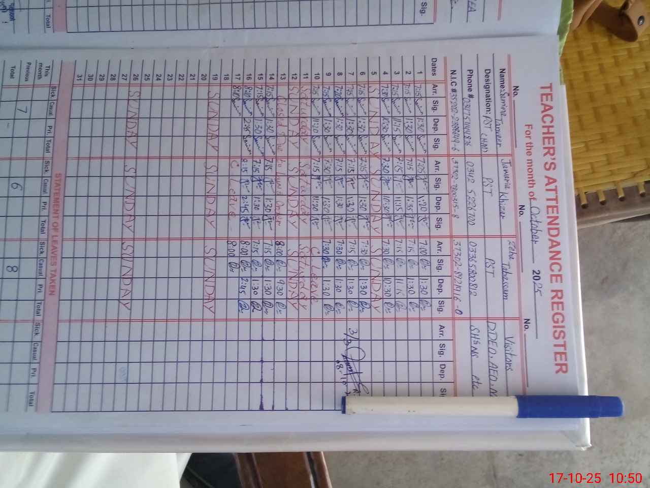 | CNIC | Full Name | Designation | R/C | Absence during last cal. month |