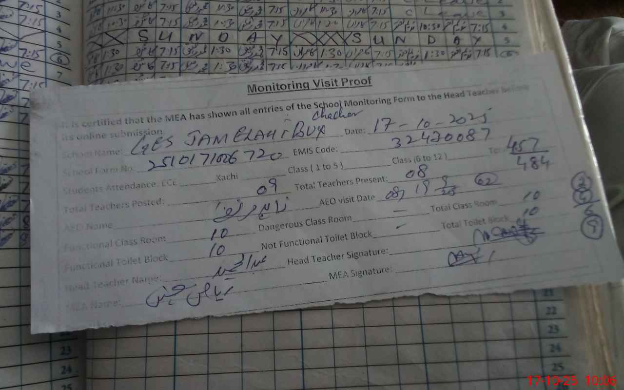 | EMIS Code: 32430087 | Name of School: GES BASTI JAM ELLAHI BUX CHACHAR | |||