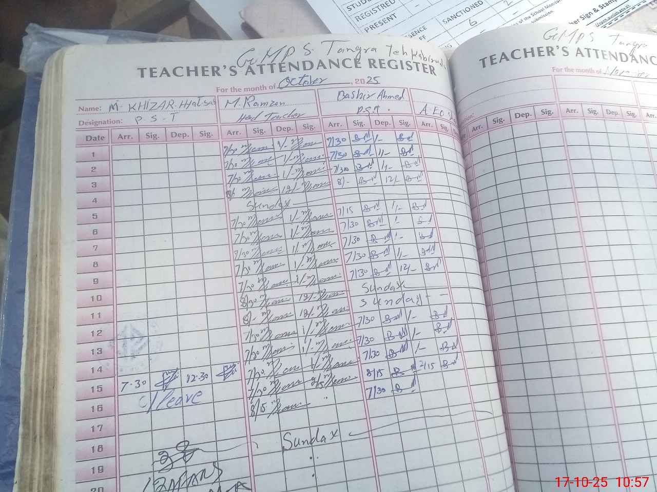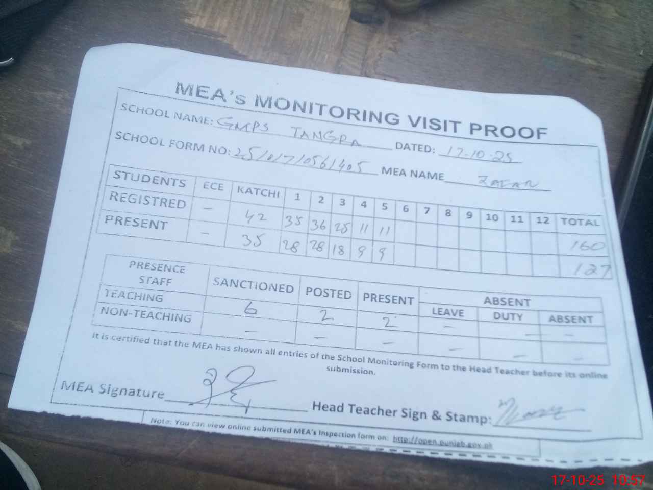 | Attendance Register | Head Teacher | MEA with School | Visit Proof |