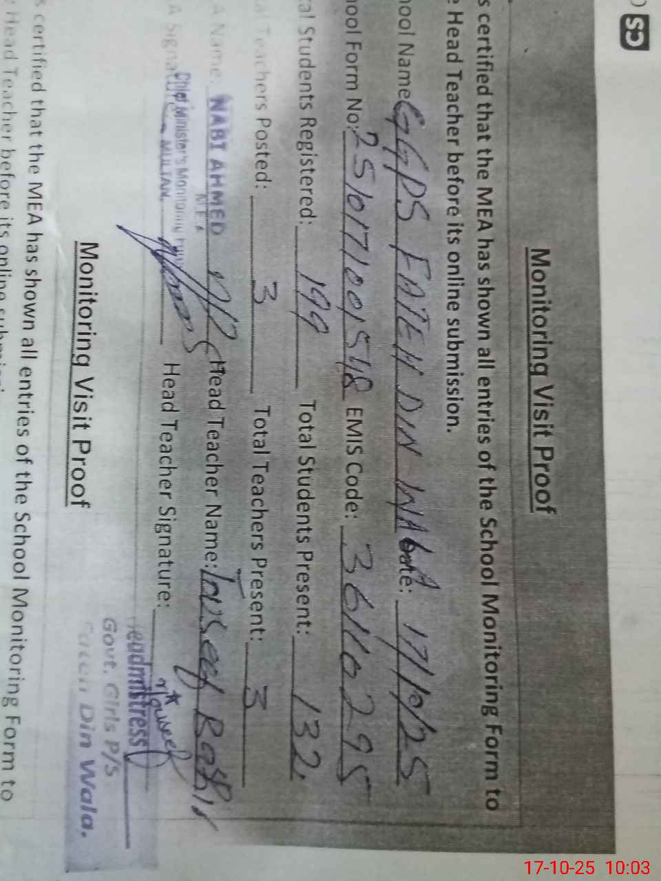 | Name: To**** Ba**** Designation: (School Headmaster's/Headmistress's) HEADMISTRESS Phone/Cell Number: 03**** |