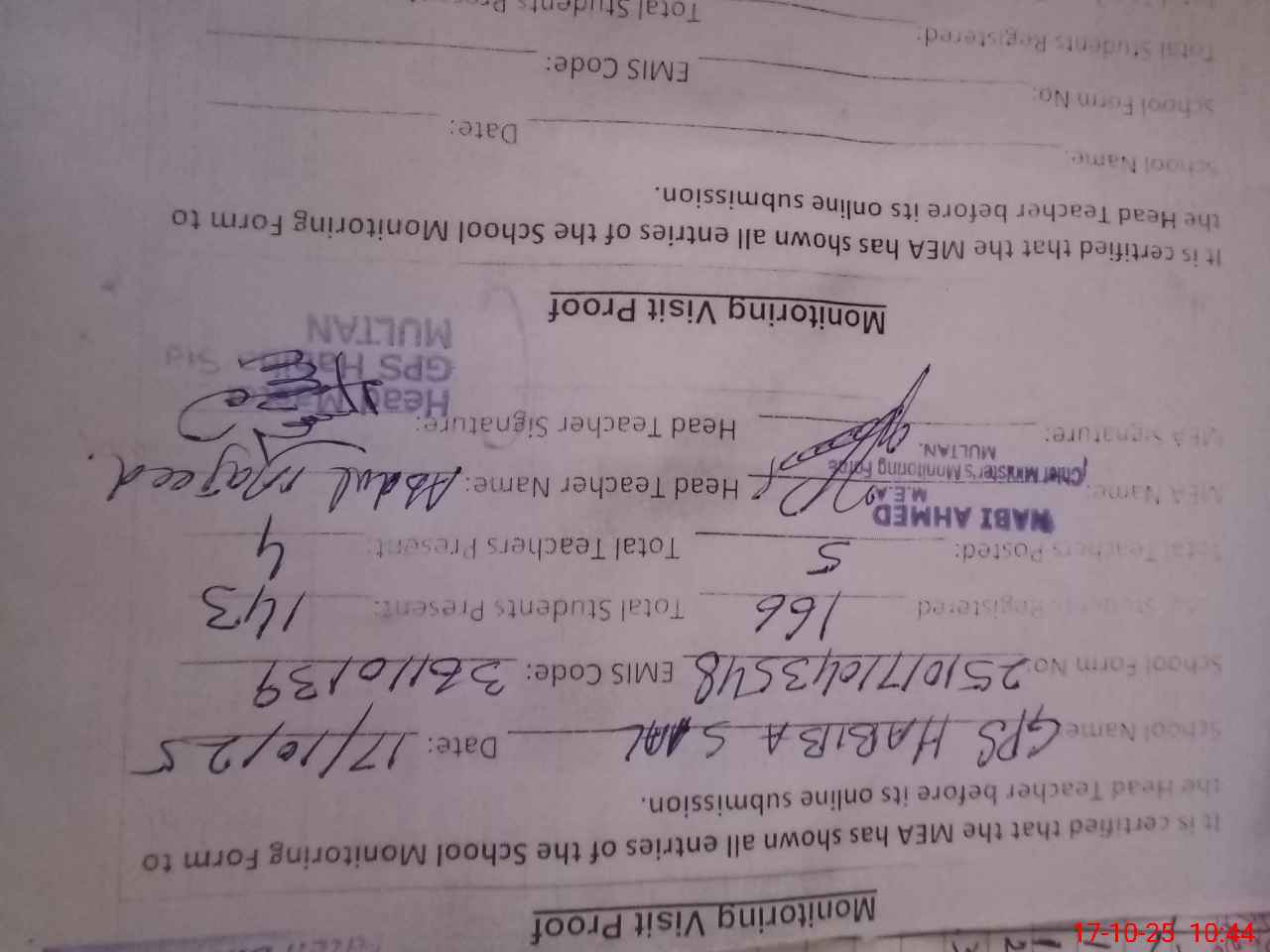 | Certified that this School was Inspected by the Undersigned MEA/DMO Today and the Information Stated Above is as Per Record. | |||||