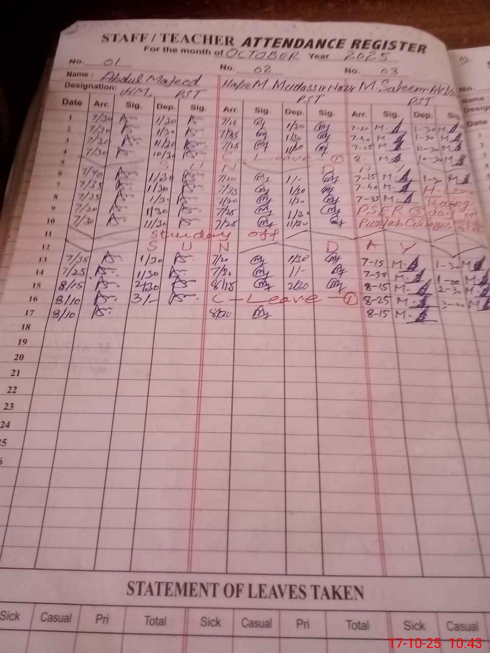 | CNIC | Full Name | Designation | R/C | Absence During Last Calender Month |