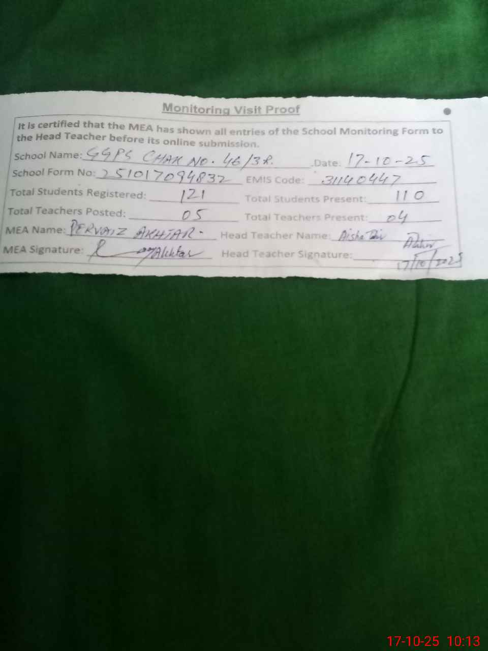 | EMIS Code: 31140447 | Name of School: GGPS CHAK NO. 46/3R AB | |||