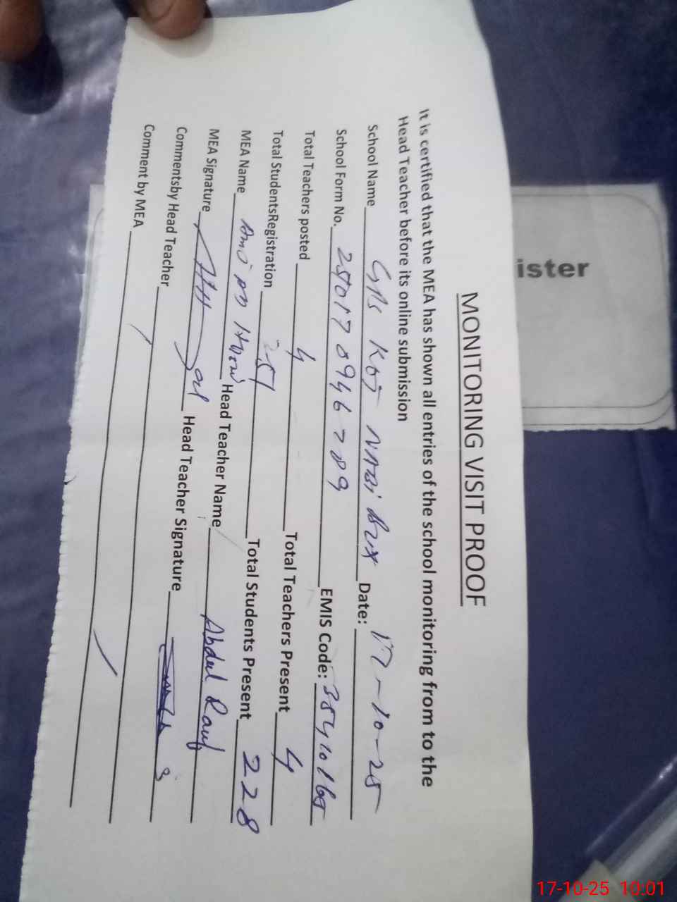 | Attendance Register | Head Teacher | MEA with School | Visit Proof |