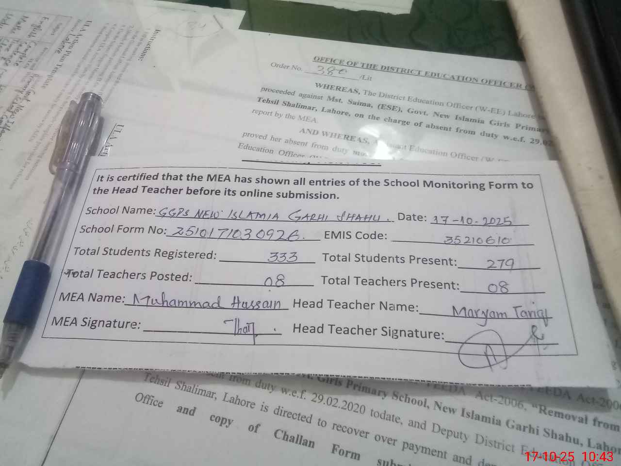 | Remarks (Use Separate Page if Required): 1 Sohail Habib sweeper working in GGPS NO 1 BAGHBAN PURA for temporary basis 89 days and duty letter expired on 14th July 2025 and no furthure order so mark him absent from duty | |||||