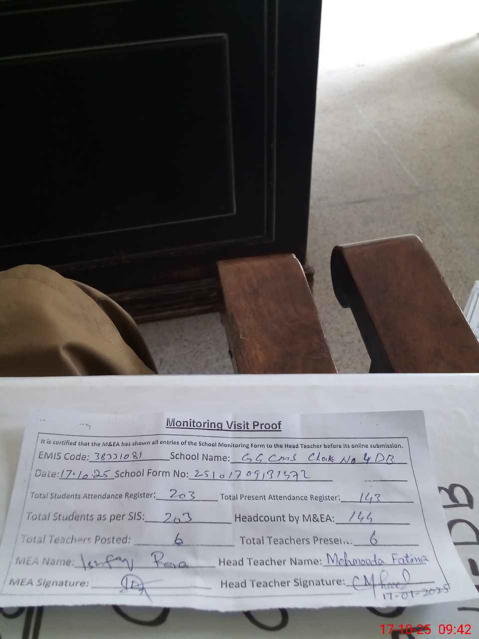 | Attendance Register | Head Teacher | MEA with School | Visit Proof |