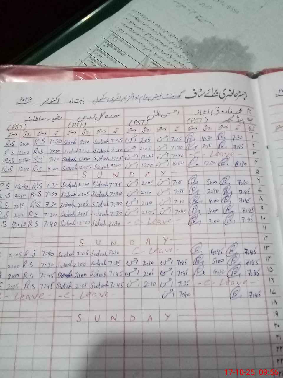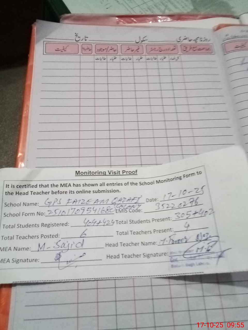 | Remarks (Use Separate Page if Required): NSB and FTF bank statements are not available after June 2025 School has paid 35000 Rs tax in August 2025 from NSB but no receipt or any other document available No soap found at students hand wash points Two PST teachers are teaching in second shift and both are on board duty so second shift is being run by care teachers Present students percentage of morning shift is 76 whereas second shift attendance noted from roznamcha 35220276 | |||||
