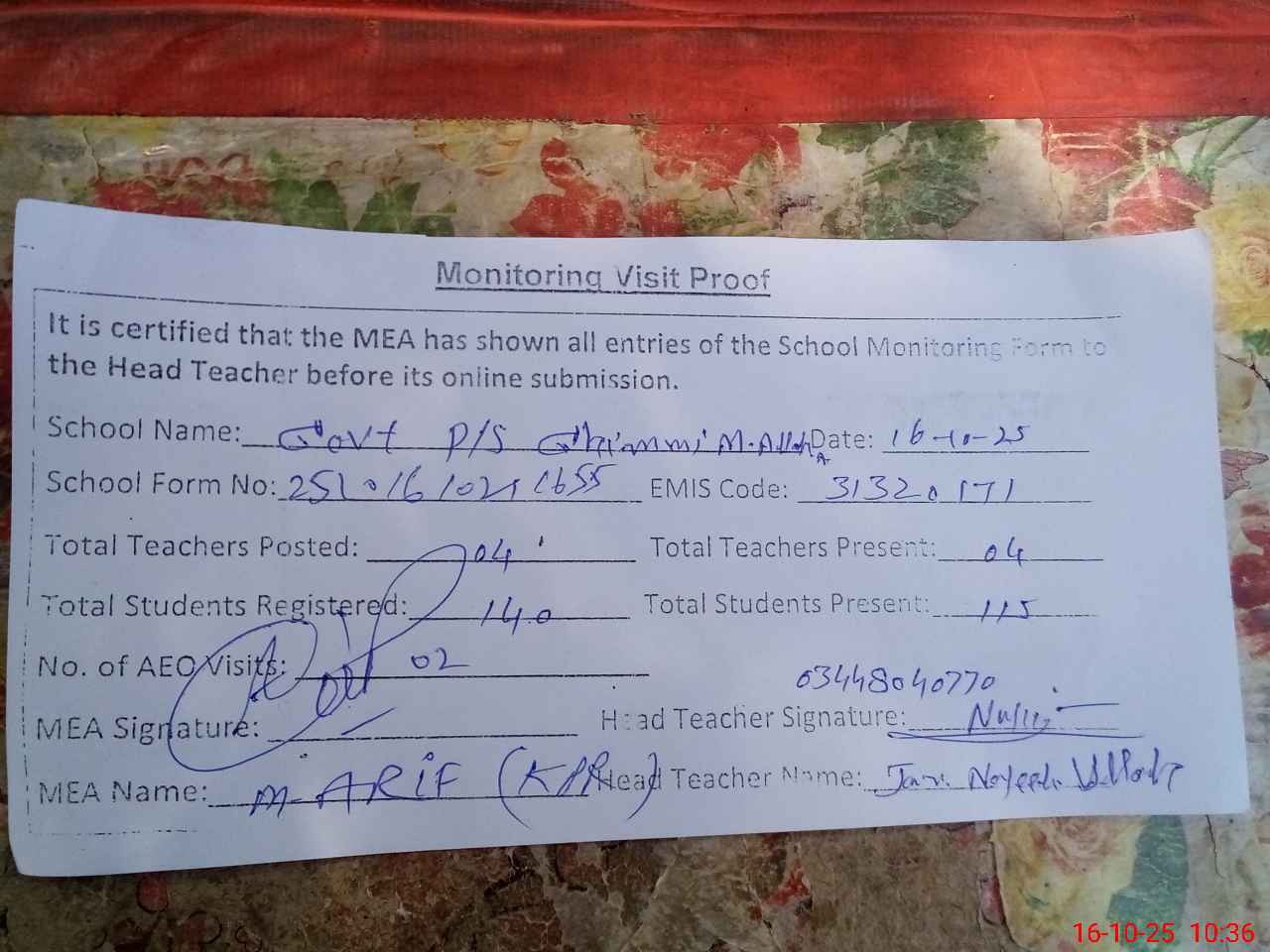 | Attendance Register | Head Teacher | MEA with School | Visit Proof |