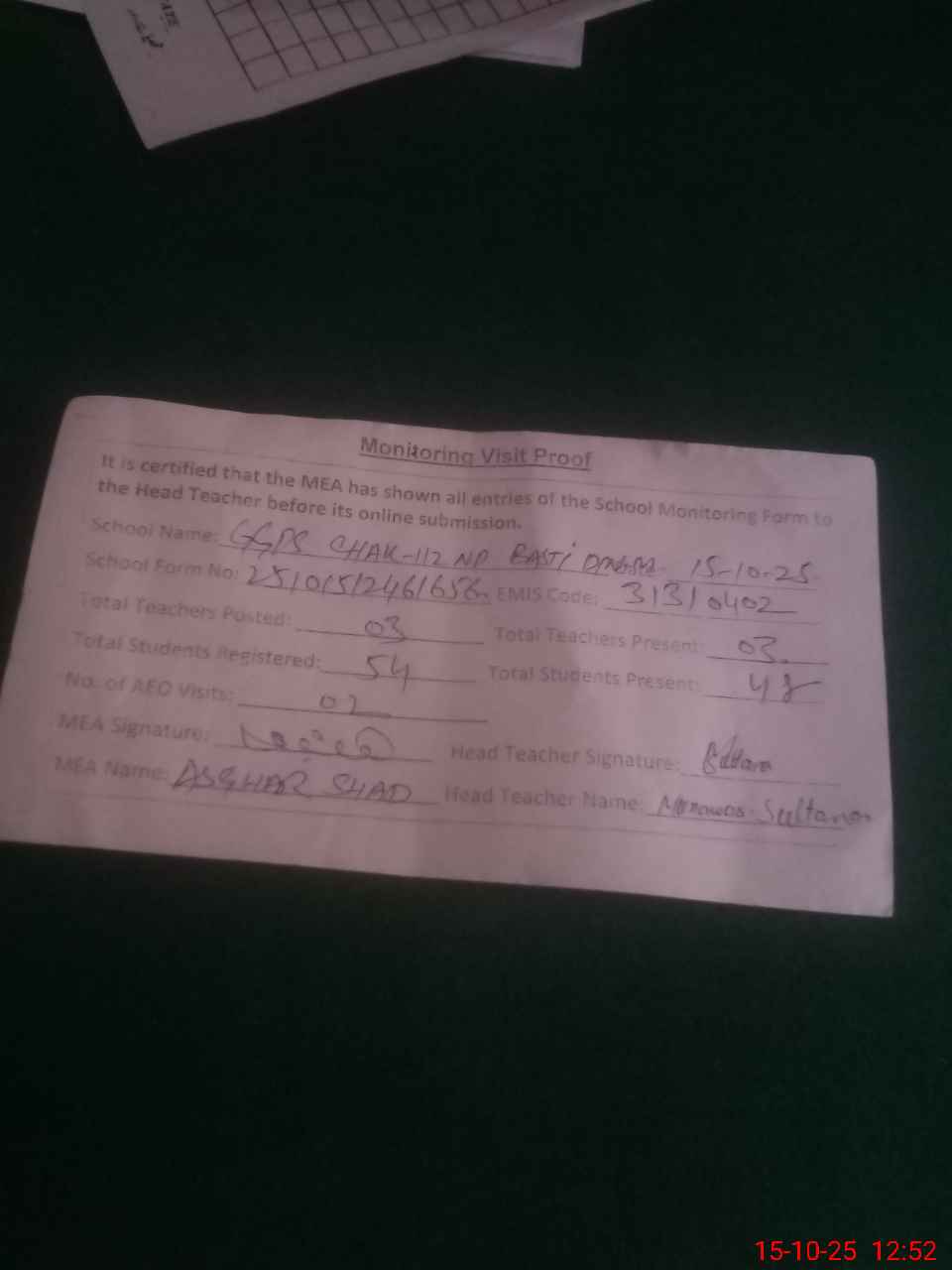 | Attendance Register | Head Teacher | MEA with School | Visit Proof |