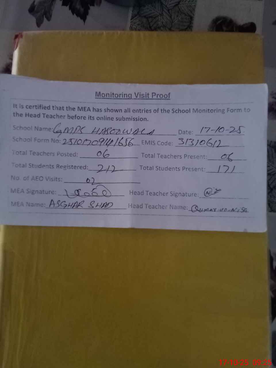 | EMIS Code: 31310612 | Name of School: GMPS HASOO WALA (After Noon) | |||